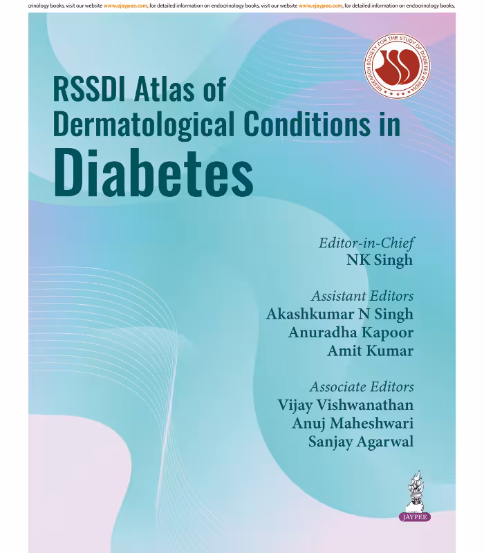 The RSSDI Skin Atlas of Diabetes provides a concise and clinically relevant overview of the diverse skin changes associated with diabetes. It highlights how early cutaneous signs can serve as valuable indicators of underlying metabolic dysfunction, simplifying complex pathophysiology and linking it to real-world clinical presentations. Rich in visuals and practical guidance, the atlas empowers clinicians to recognise, diagnose, and manage diabetic dermatoses more effectively. This book serves as an essential tool for diabetologists, dermatologists, general physicians, and postgraduate trainees involved in diabetes care.